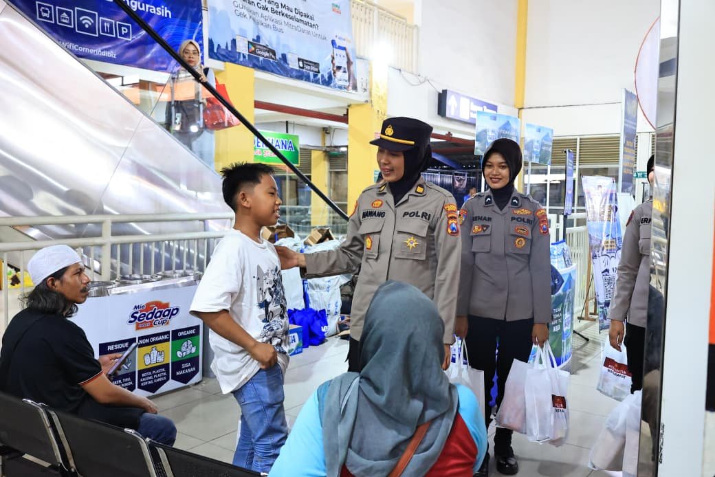 Beberapa Polwan terlihat mendatangi masyarakat yang tengah duduk di ruang tunggu keberangkatan bus, serta para penumpang yang beristirahat di Pos Pengamanan Operasi Lilin Semeru 2025.