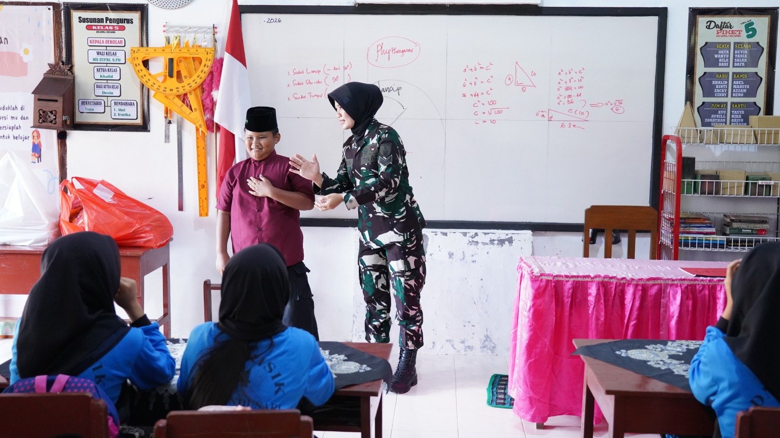 Sertu (K) Mira salah satu personel Satgas TMMD ke 127 Kodim 0808/Blitar, terlihat mengambil peran sebagai guru dengan berinteraksi langsung dengan para pelajar di ruang kelas UPT SD Negeri 4 Krisik, Selasa (24/02/2026)