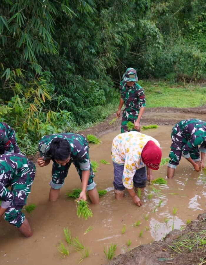 BATAVIAINEWS.COM Blitar – Dalam mendukung program ketahanan pangan nasional, Satgas TNI Manunggal Membangun Desa (TMMD) Ke 127 Kodim 0808/Blitar bersama warga dan kelompok tani melaksanakan kegiatan penanaman padi di lahan pertanian Desa Krisik Kecamatan Gandusari, Senin (23/2/2026).