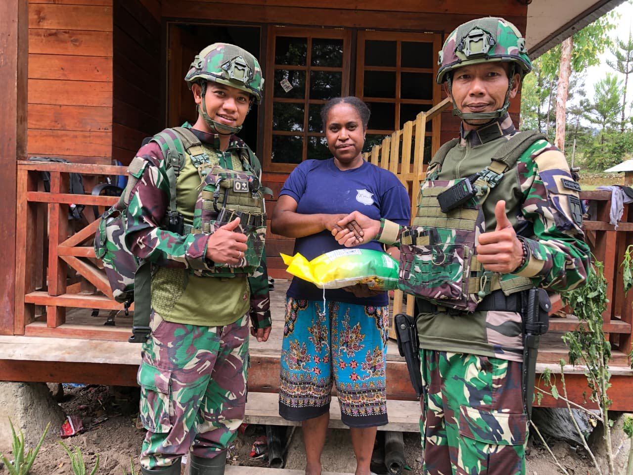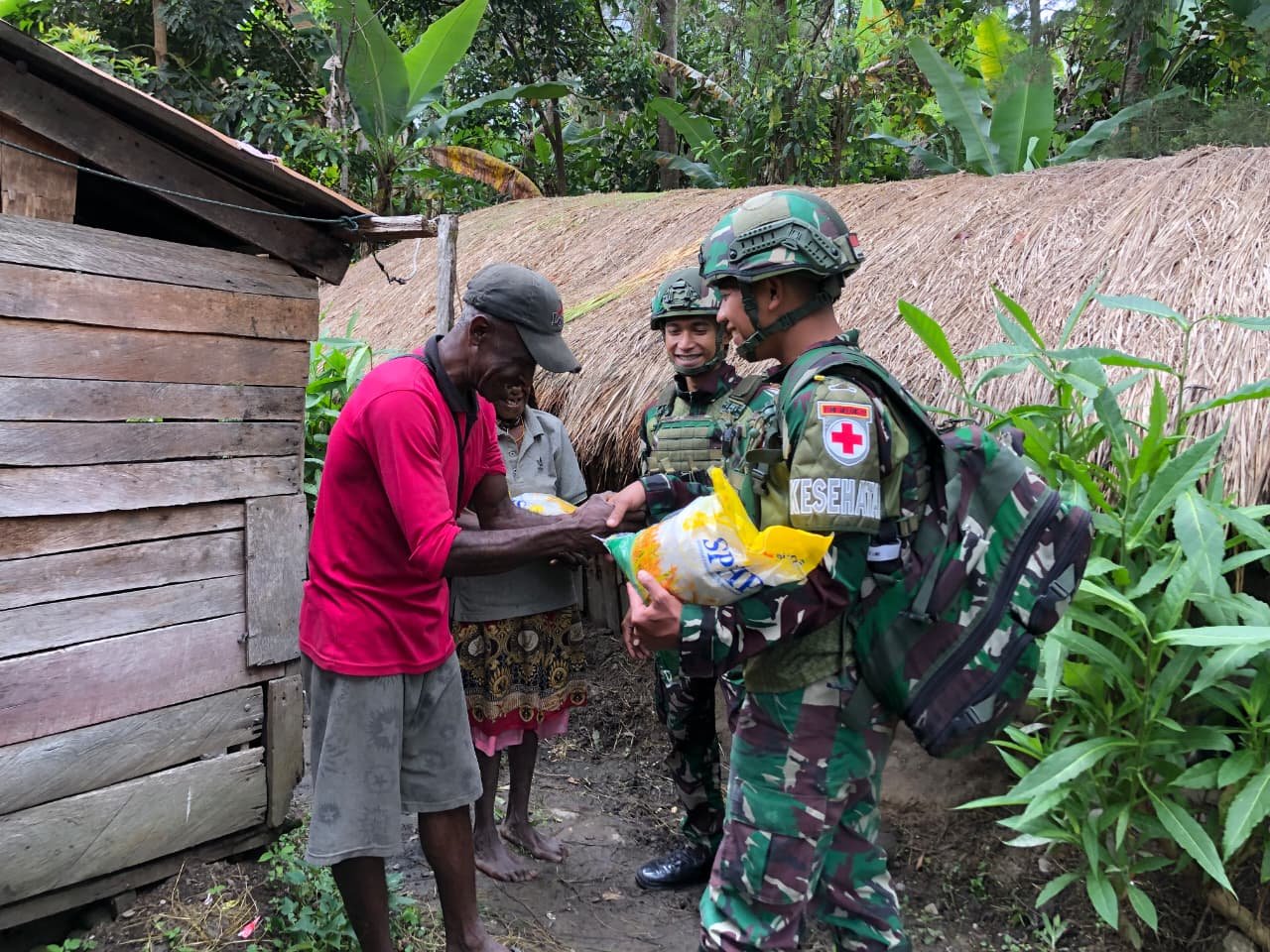 Kepedulian dan kehangatan prajurit Satgas Yonif 521/DY dalam penyaluran sembako, Mereka turun langsung ke kampung-kampung untuk membagikan sembako berupa beras kepada warga.