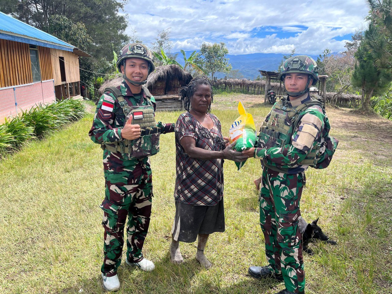 Satgas Yonif 521/DY Menyalurkan paket beras Gratis kepada warga dari Kodam XVII Cenderawasih
