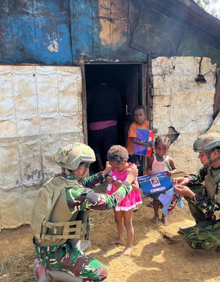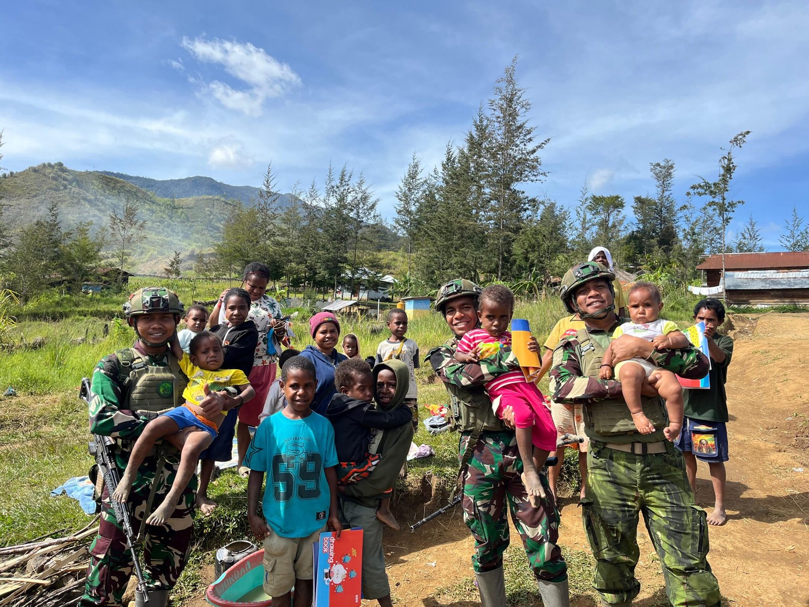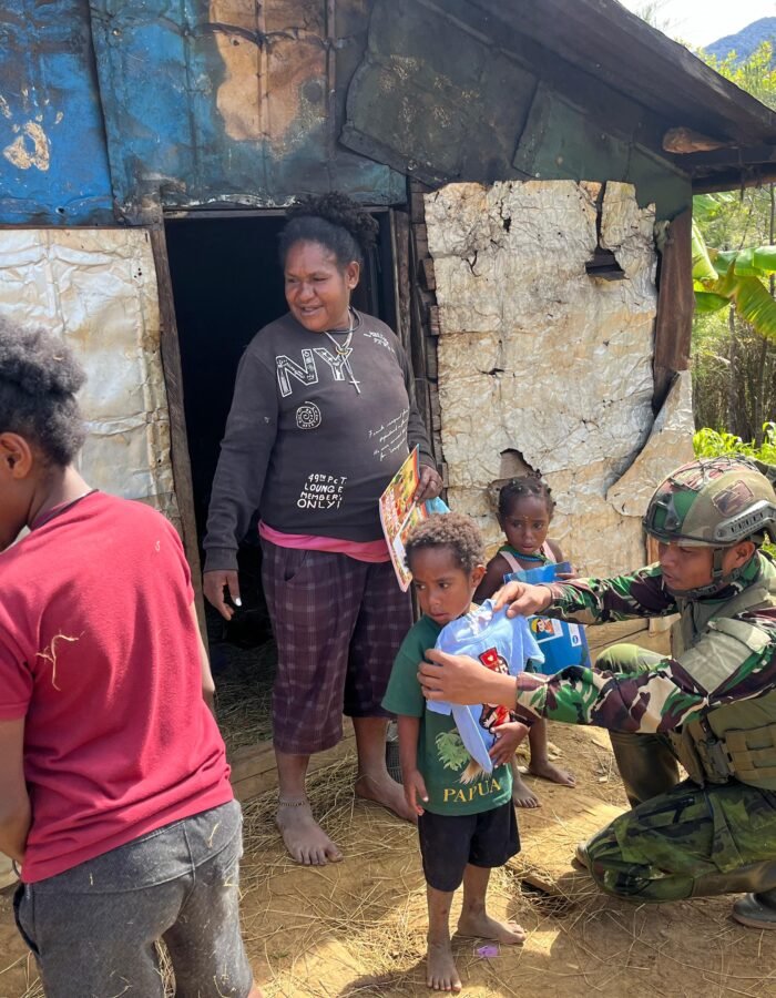 Dalam kegiatan tersebut, personel Satgas membagikan berbagai kebutuhan, mulai dari buku bacaan untuk anak-anak, hingga pakaian layak pakai bagi warga Kampung Yenggernok. Kehadiran prajurit disambut antusias oleh masyarakat yang tampak berkumpul sejak pagi untuk mengikuti kegiatan.