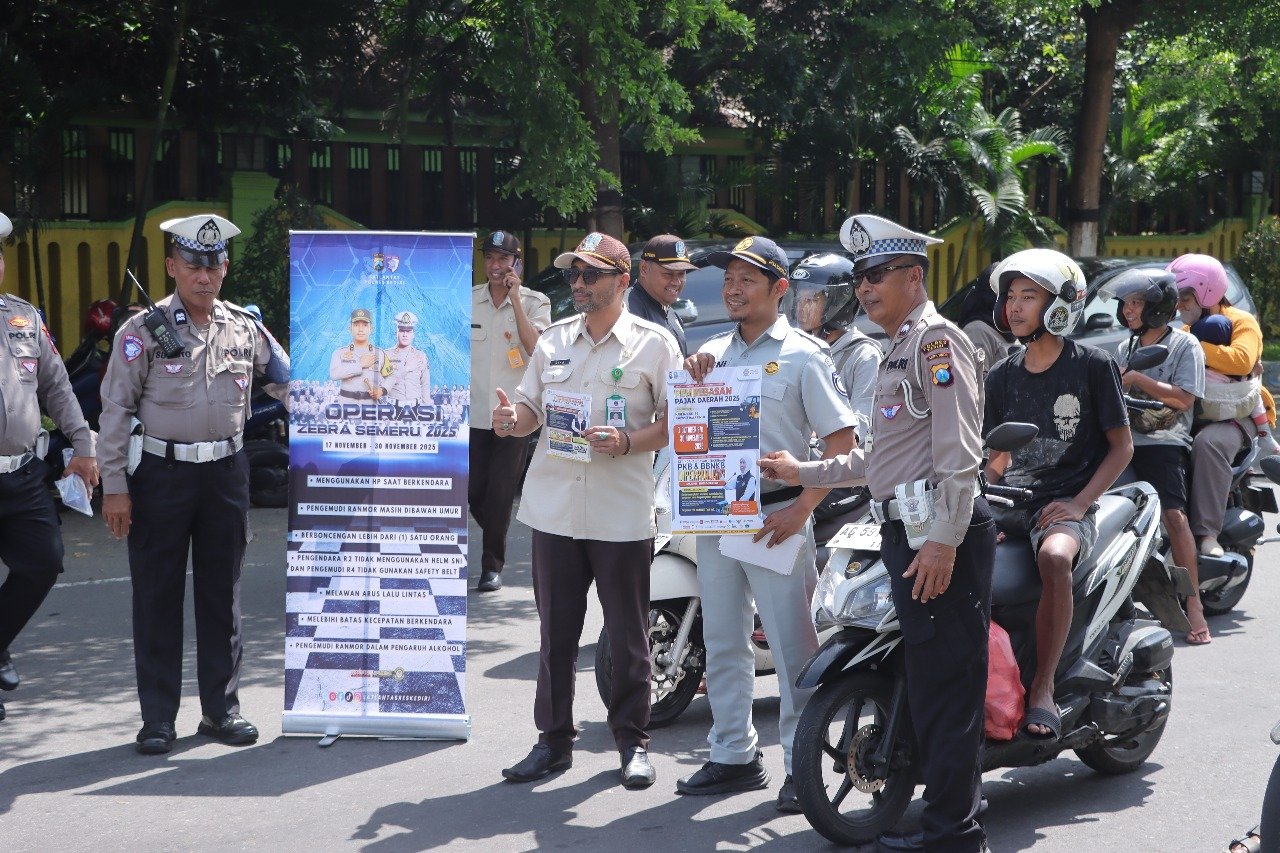 Personel Satlantas Polres Kediri bersama Dispenda dan Jasa Raharja turun langsung ke lapangan untuk mengajak masyarakat memanfaatkan masa Pembebasan Pajak Daerah 2025, sekaligus mengedukasi pentingnya keselamatan berlalu lintas dalam rangkaian Operasi Zebra 2025.
