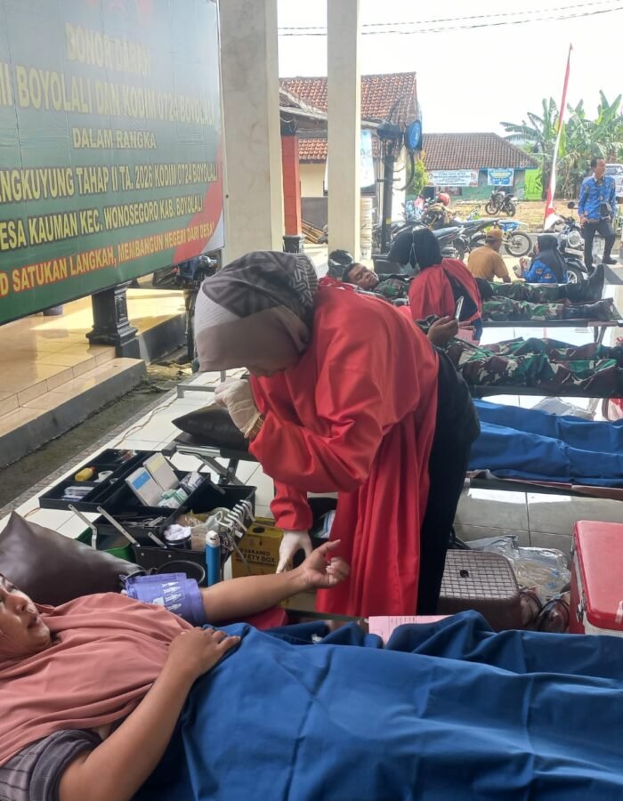 BATAVIAINEWS.COM Boyolali – Semangat kepedulian dan kebersamaan kembali ditunjukkan Kodim 0724/Boyolali melalui kegiatan non fisik dalam program TMMD Sengkuyung. Bersinergi dengan PMI Kabupaten Boyolali, digelar bakti sosial donor darah yang berlangsung di Balai Desa Kauman, Kecamatan Wonosegoro, Senin (27/04/26). Kegiatan ini menjadi wujud nyata kontribusi TNI dalam membantu sesama sekaligus memperkuat kemanunggalan dengan rakyat.