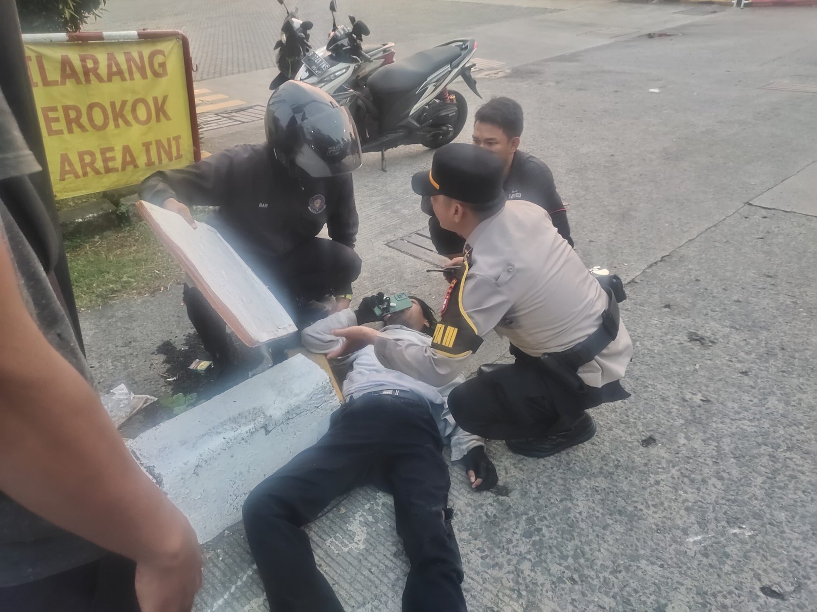 Dalam perjalanan, para personel yang dipimpin Pamapta 3 Polres Metro Jakarta Barat Ipda Iwan Diego Maradona, SH melihat seorang pengendara motor terjatuh dan tampak mengalami luka akibat kecelakaan tunggal.