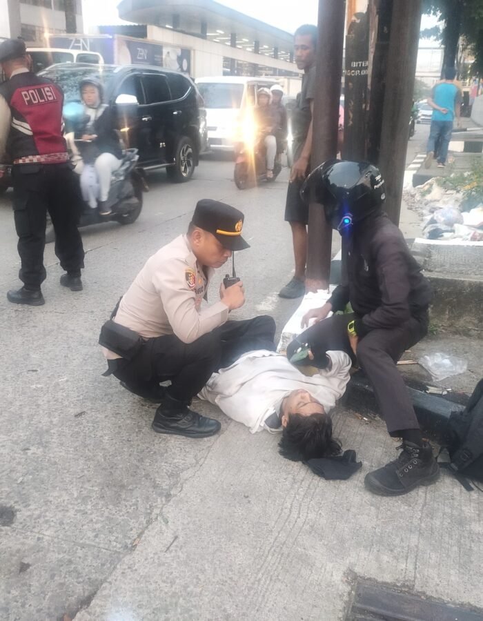 BATAVIAINEWS.COM Jakarta Barat — Aksi sigap diperlihatkan oleh anggota Pamapta 3 Polres Metro Jakarta Barat saat menjumpai seorang pengendara sepeda motor yang mengalami kecelakaan tunggal di depan SPBU Shell, Jalan Daan Mogot, Duri Kepa, Kebon Jeruk, Jakarta Barat, Senin (1/12/2025).