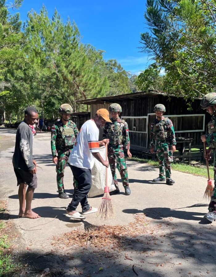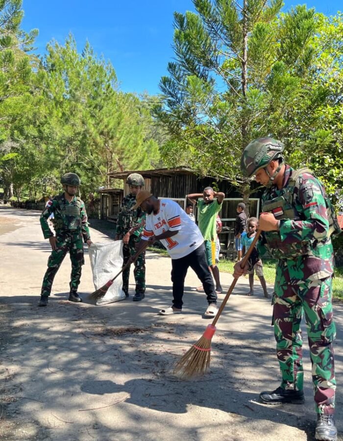 Kegiatan ini merupakan wujud nyata sinergi antara TNI dan masyarakat dalam menjaga kebersihan lingkungan sekaligus mempererat hubungan kekeluargaan. Dengan penuh semangat gotong royong, personel Satgas bersama warga bahu-membahu membersihkan area pemukiman, fasilitas umum, serta lingkungan sekitar kampung.