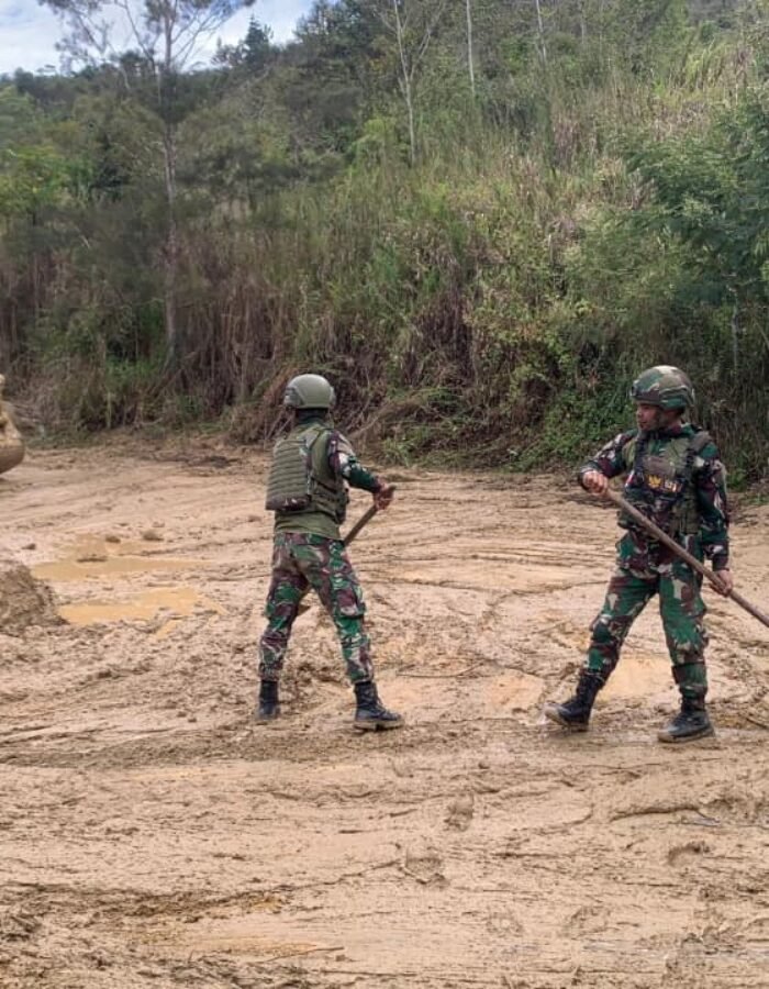 Sinergitas TNI–POLRI, Satgas Yonif 521/DY Karya Bhakti Tangani Tanah Longsor di Distrik Kelila
