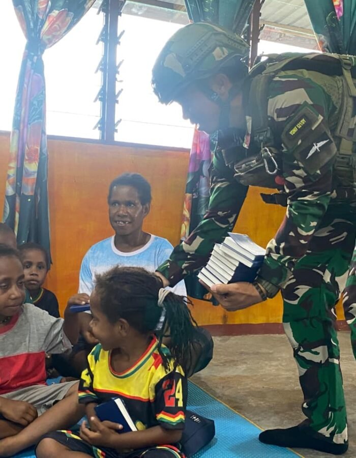 BATAVIAINEWS.COM Elilem, – Wujud kepedulian dan kedekatan dengan masyarakat terus ditunjukkan oleh Satgas Yonif 521/DY dalam pelaksanaan tugasnya di wilayah Papua Pegunungan, Melalui kegiatan teritorial yang humanis, Satgas Yonif 521/DY melaksanakan aksi berbagi Alkitab kepada jemaat di Gereja GBI Shekinah, Distrik Elelim, Kabupaten Yalimo, Papua Pegunungan. (24/4/2026).