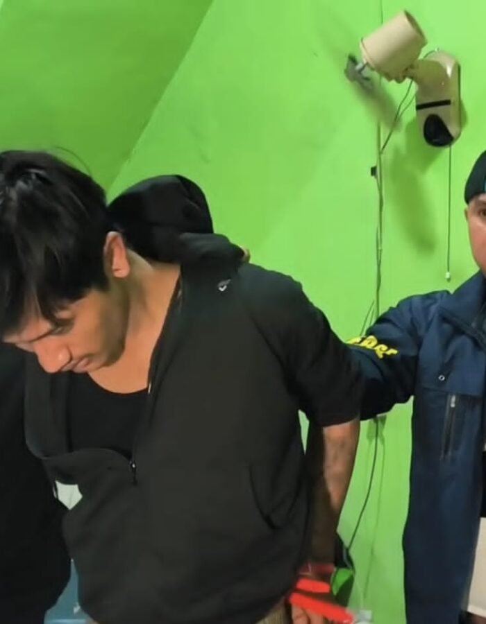 Ia kemudian digelandang ke mobil polisi dengan mengenakan kaos hitam, sementara tato jaring laba-laba tampak jelas di lengan kirinya.