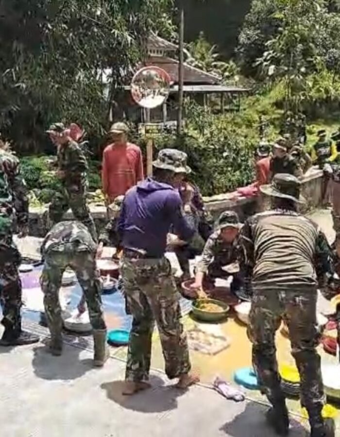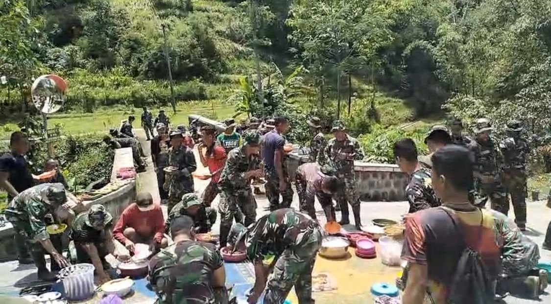 Momen makan bersama nasi kondangan/bungkus menunjukkan kekompakan, di mana warga secara swadaya menyiapkan makanan untuk prajurit yang bertugas membangun infrastruktur desa.