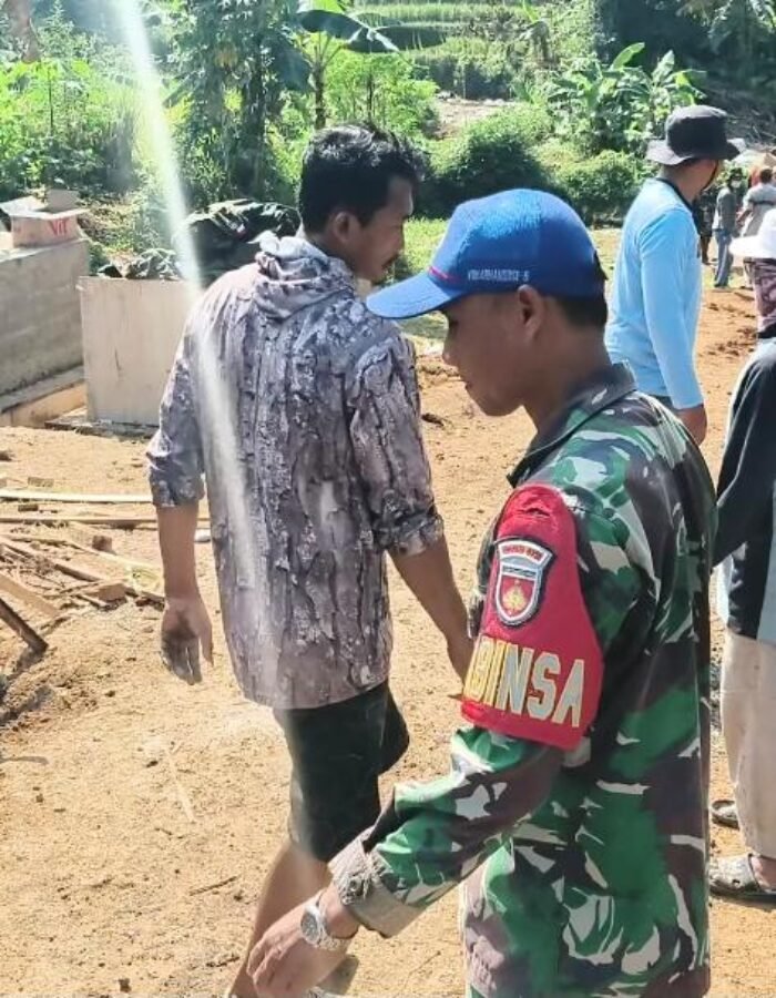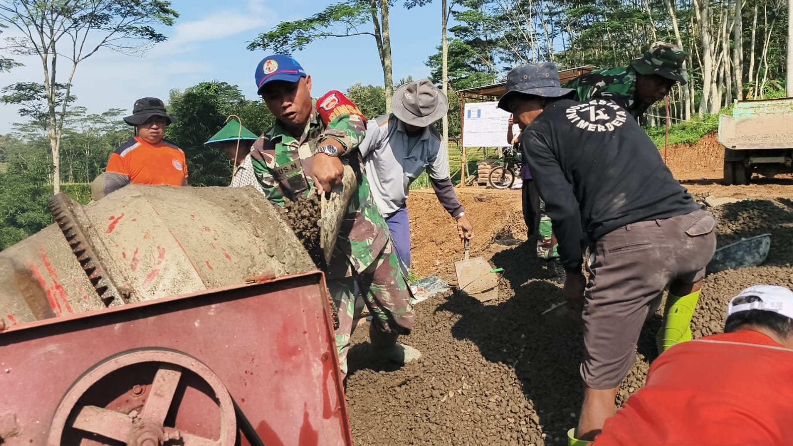 Bersama warga, ia bahu membahu memasukkan material bangunan ke mesin molen untuk mempercepat proses pengecoran. Kehadiran Babinsa di tengah masyarakat menjadi penyemangat tersendiri, sekaligus bukti nyata bahwa TNI selalu hadir membantu kesulitan rakyat.