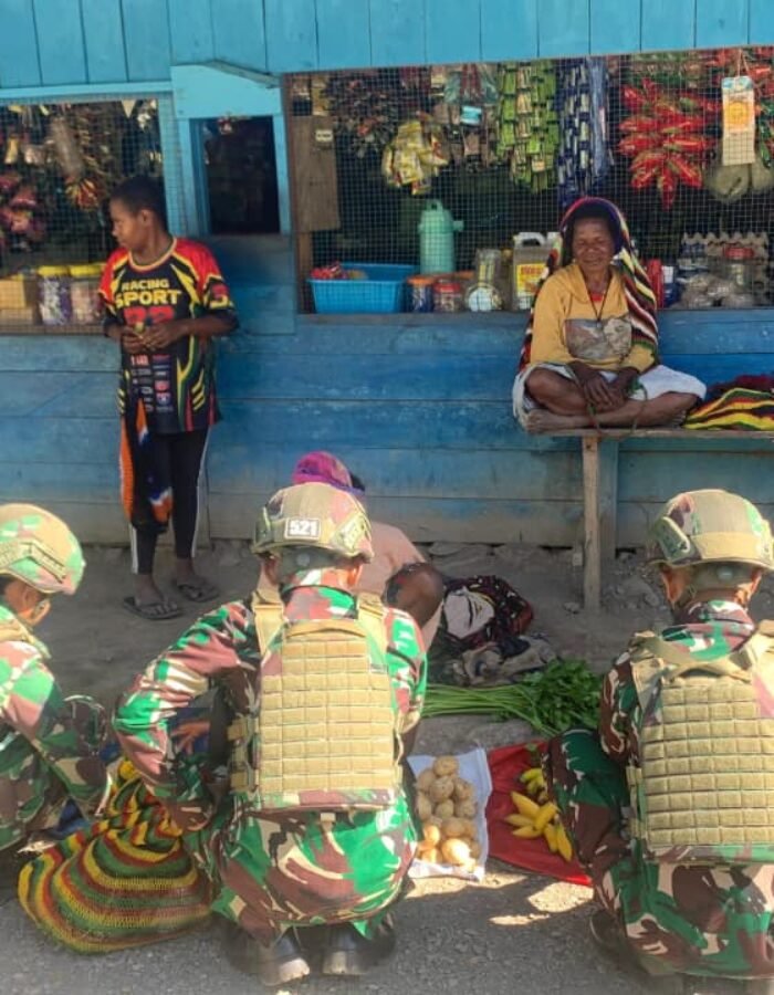 ” Mama Mira (47 Tahun) salah satu pedagang Mama Papua mengatakan sering anggota Satgas Yonif 521/DY belanja di pasar ini, untuk membeli sayuran dan lauk memenuhi kebutuhan dapur, kami pedagang begitu senang dikarenakan tawar menawar sayuran dengan begitu ramah dan canda tawa.” ungkapnya.
