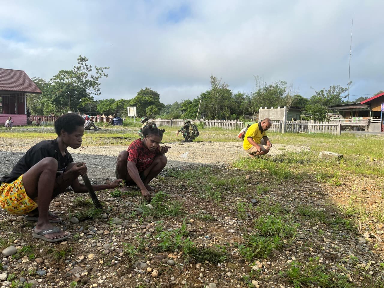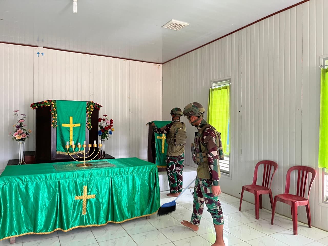 Prajurit TNI Satgas Yonif 521/DY secara rutin melakukan kegiatan gotong royong bersama warga untuk membersihkan gereja di berbagai wilayah di Distrik Airu, Jayapura, (23/11/2025). Kegiatan ini tidak hanya menjaga kebersihan, tetapi juga menjadi simbol nyata kebersamaan lintas agama dan mengunjungi tokoh-tokoh agama, adat, dan masyarakat untuk bersilaturahmi dan memperkuat komunikasi sosial.