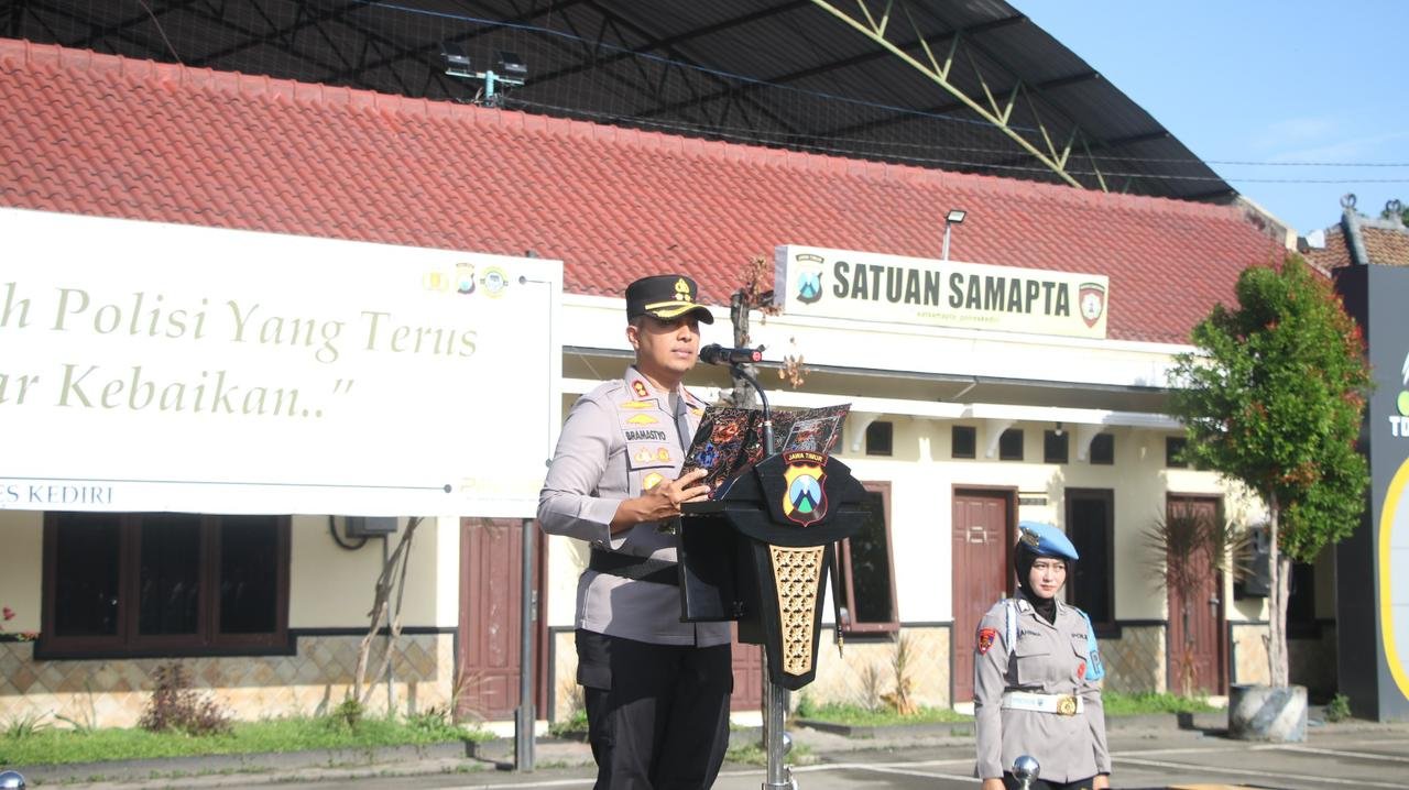 Upacara dipimpin langsung Kapolres Kediri AKBP Bramastyo Priaji, S.H., S.I.K., M.Si. sebagai inspektur upacara, diikuti Wakapolres Kediri Kompol Hari Kurniawan, S.H., M.H., para Pejabat Utama (PJU) dan personel Polres Kediri, serta Kapolsek jajaran.